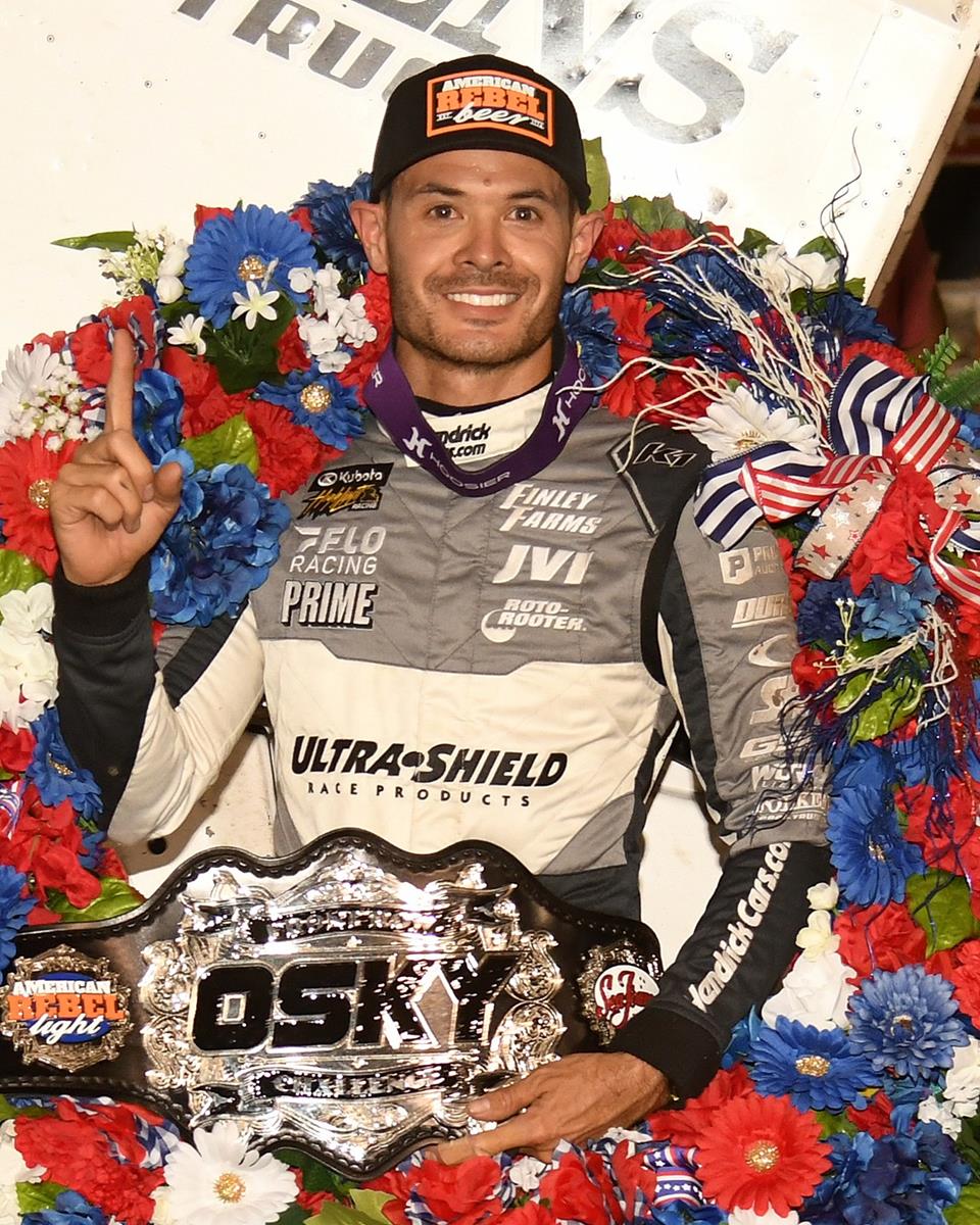 Photo: Kyle Larson cashed $21,000 in his fourth Front Row Challenge Victory in Oskaloosa Monday (Paul Arch Photo)
